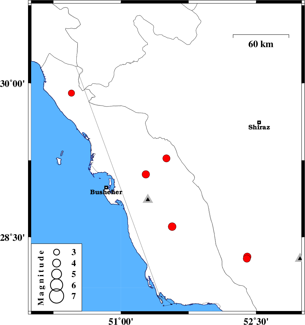 | 2022/06/04 | 11:02:29.2 | 15:32:29.2 | 28.601 | 51.568 | 10 | ML:3.9 | Bushehr Province, 20 km -East of Khormog | ||
