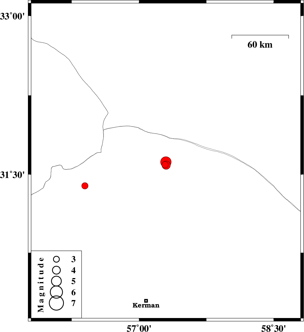 | 2022/06/26 | 15:39:00.2 | 20:09:00.2 | 31.588 | 57.303 | 12 | ML:4.3 | Kerman Province, 59 km North-East of Ravar | ||