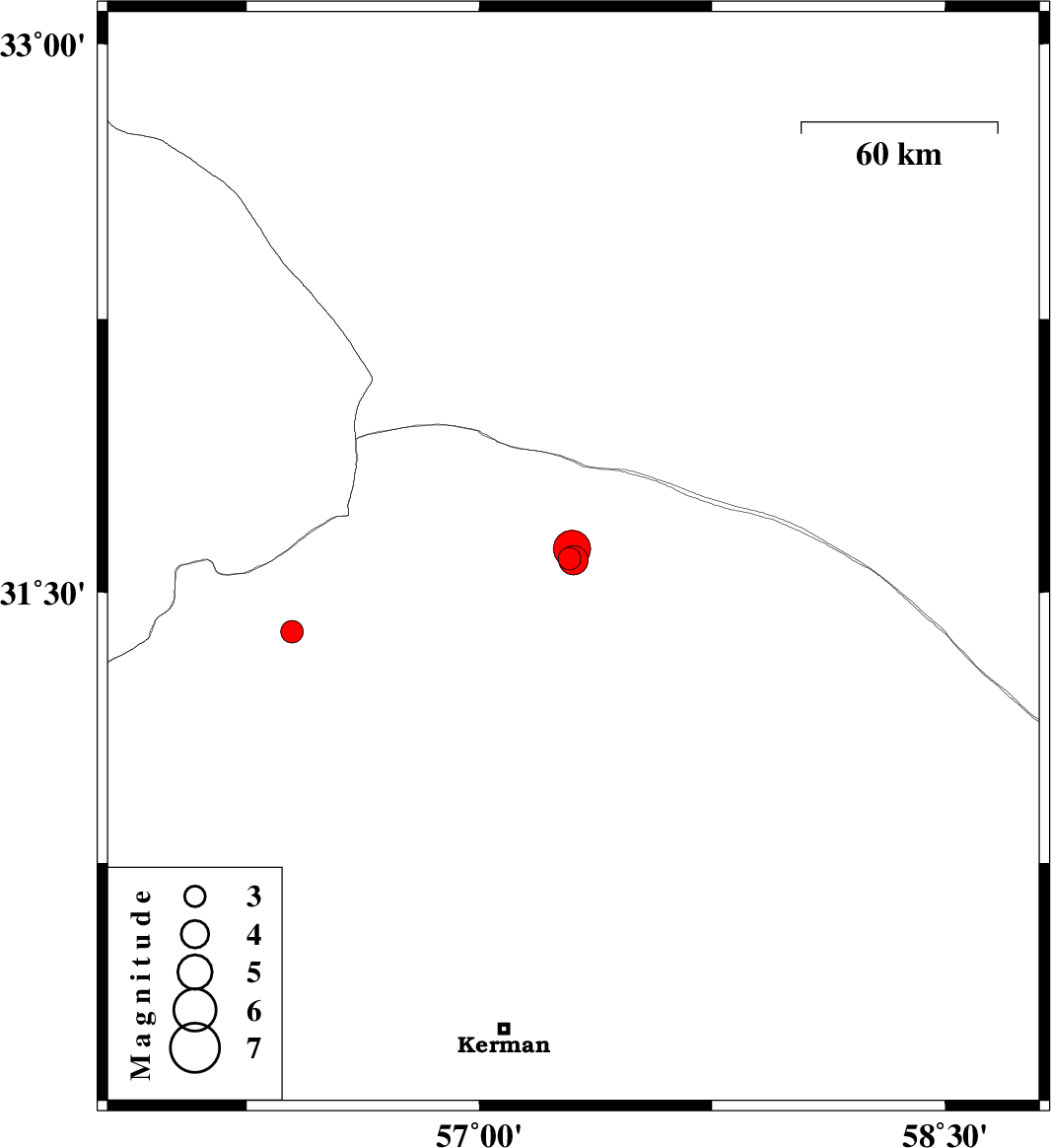| 2022/06/26 | 15:39:00.2 | 20:09:00.2 | 31.588 | 57.303 | 12 | ML:4.3 | Kerman Province, 59 km North-East of Ravar | ||