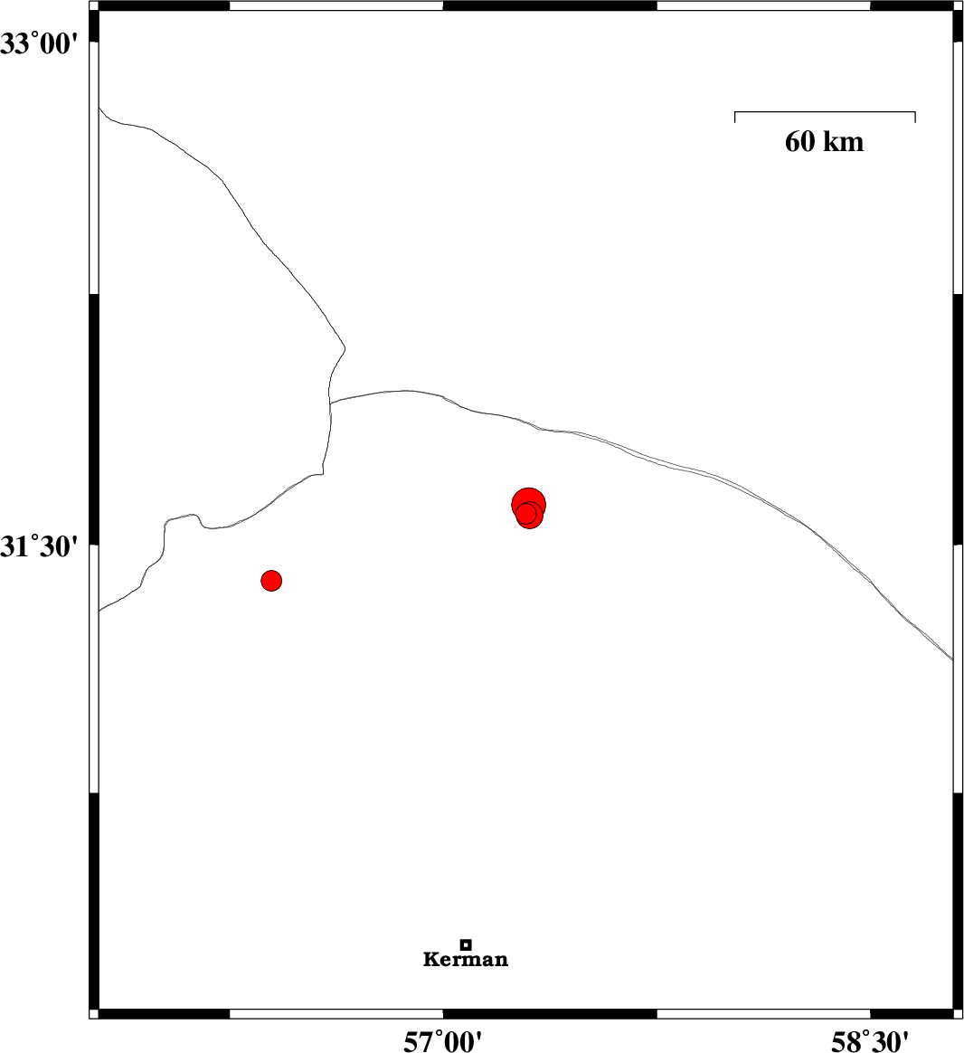 | 2022/06/26 | 15:39:00.2 | 20:09:00.2 | 31.588 | 57.303 | 12 | ML:4.3 | Kerman Province, 59 km North-East of Ravar | ||