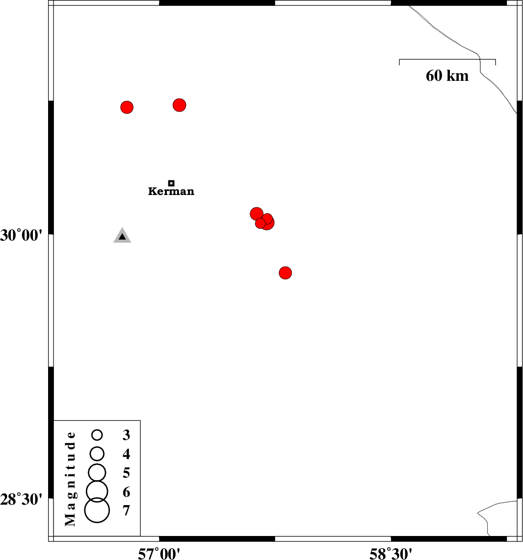 | 2022/07/13 | 12:26:52.6 | 16:56:52.6 | 28.289 | 56.714 | 9 | ML:3.1 | Kerman Province, 80 km -East of Hajiabad |