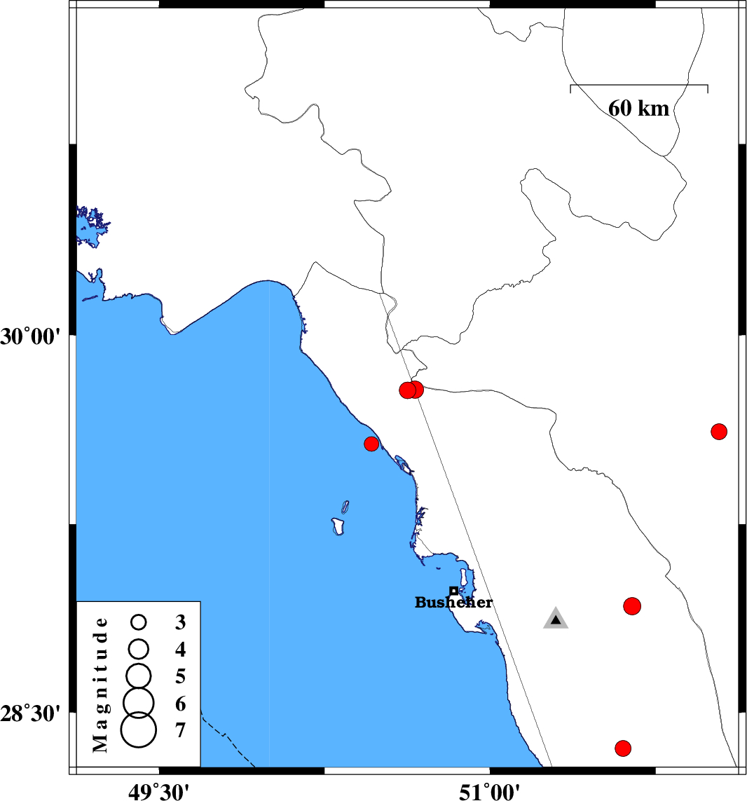| 2022/08/06 | 03:43:59.5 | 08:13:59.5 | 29.784 | 50.66 | 12 | ML:3.5 | Bushehr Province, 27 km North-East of Bandar-e genaveh | ||