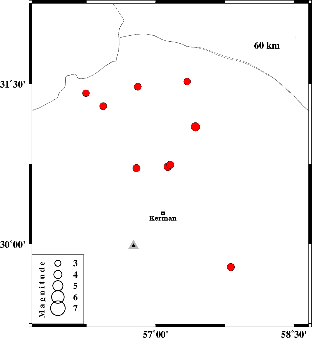 | 2022/07/20 | 05:41:32.3 | 10:11:32.3 | 31.473 | 56.806 | 12 | ML:3.5 | Kerman Province, 23 km North of Ravar |
