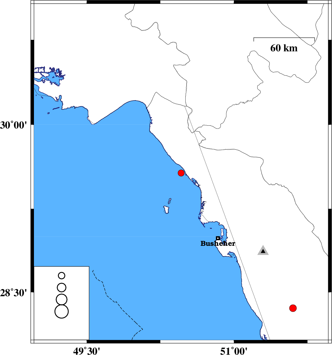 | 2022/07/23 | 16:46:01.0 | 21:16:01.0 | 29.569 | 50.462 | 12 | ML:3 | Persian Gulf, 5 km of Bandar-e genaveh | ||