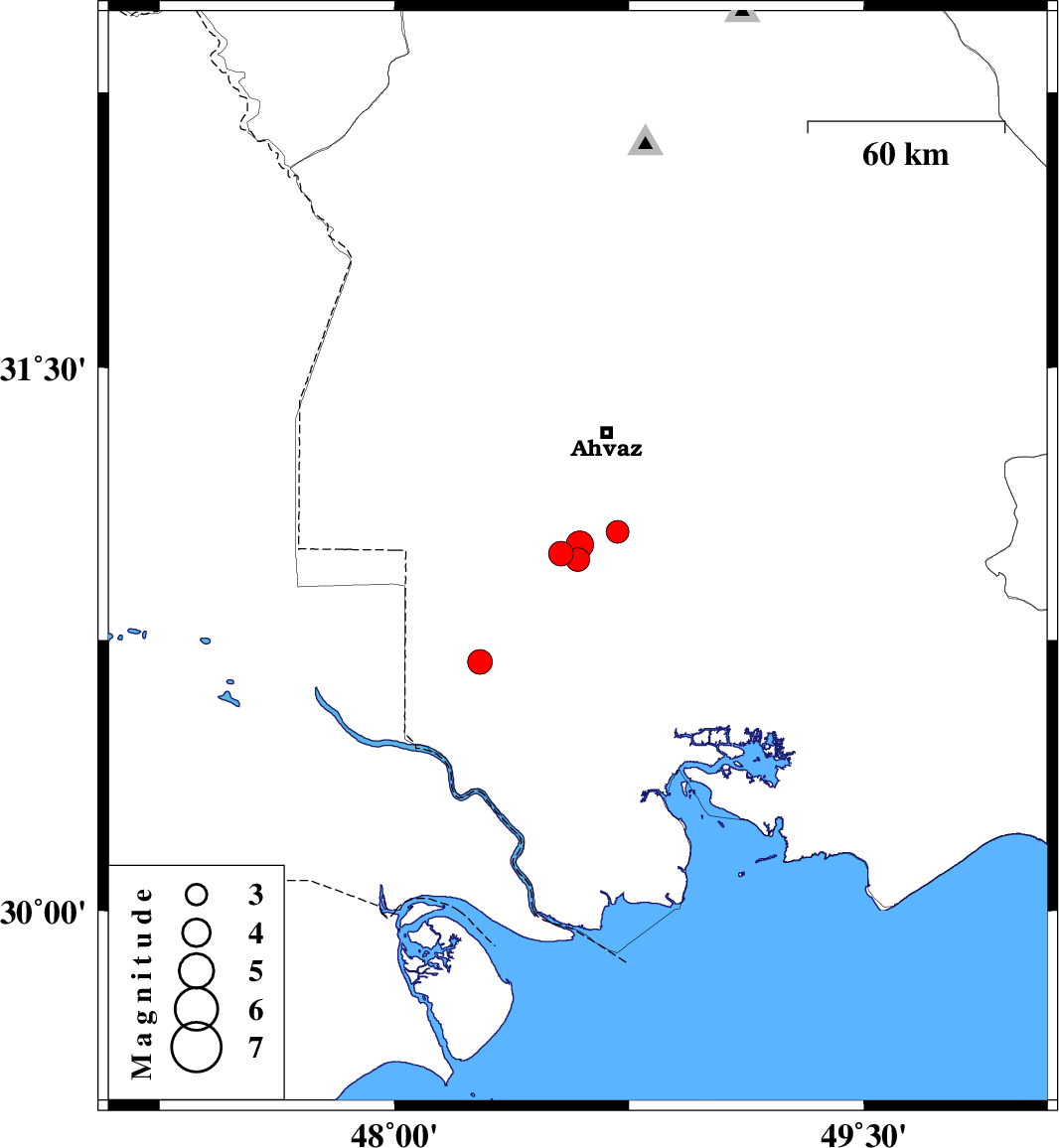 | 2022/08/25 | 19:58:31.1 | 00:28:31.1 | 30.69 | 48.274 | 12 | ML:3.5 | Khoozestan Province, 30 km North of Khorramshahr |