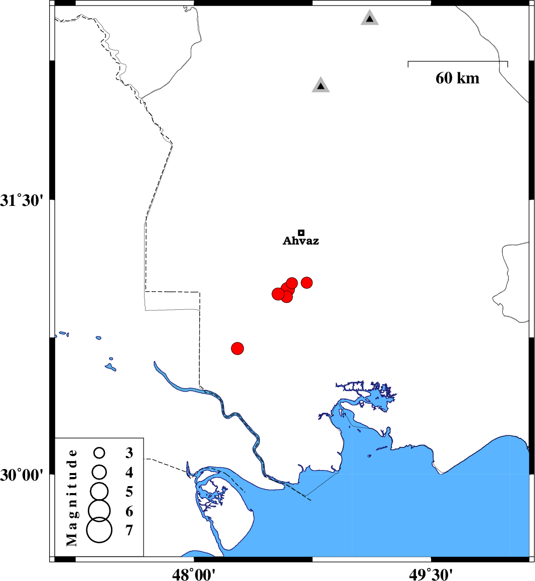 | 2022/08/25 | 19:58:31.1 | 00:28:31.1 | 30.69 | 48.274 | 12 | ML:3.5 | Khoozestan Province, 30 km North of Khorramshahr |