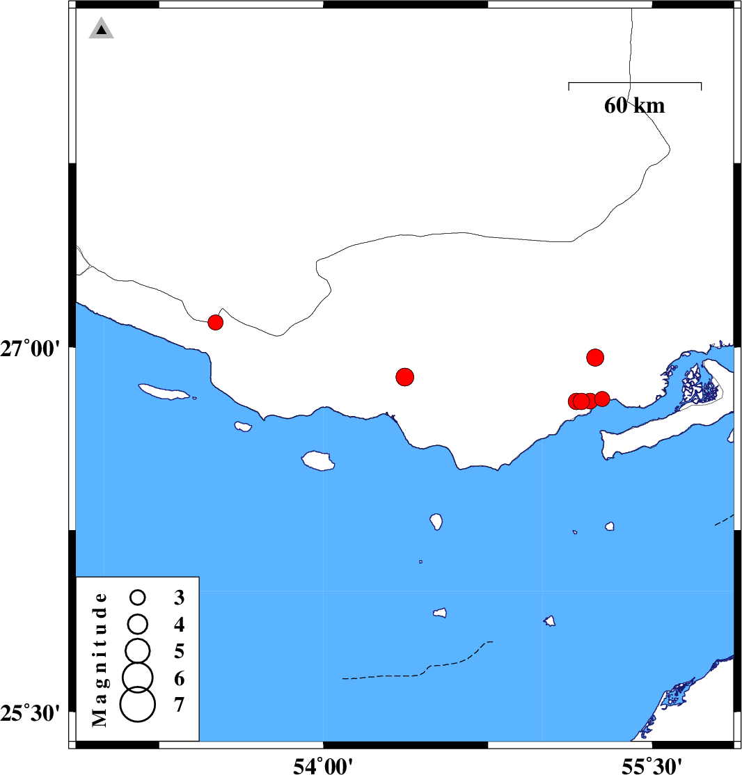 | 2022/09/14 | 20:20:49.3 | 00:50:49.3 | 26.778 | 55.154 | 15 | ML:3.4 | Hormozgan Province, 41 km North-East of Bandar-e lengeh | ||