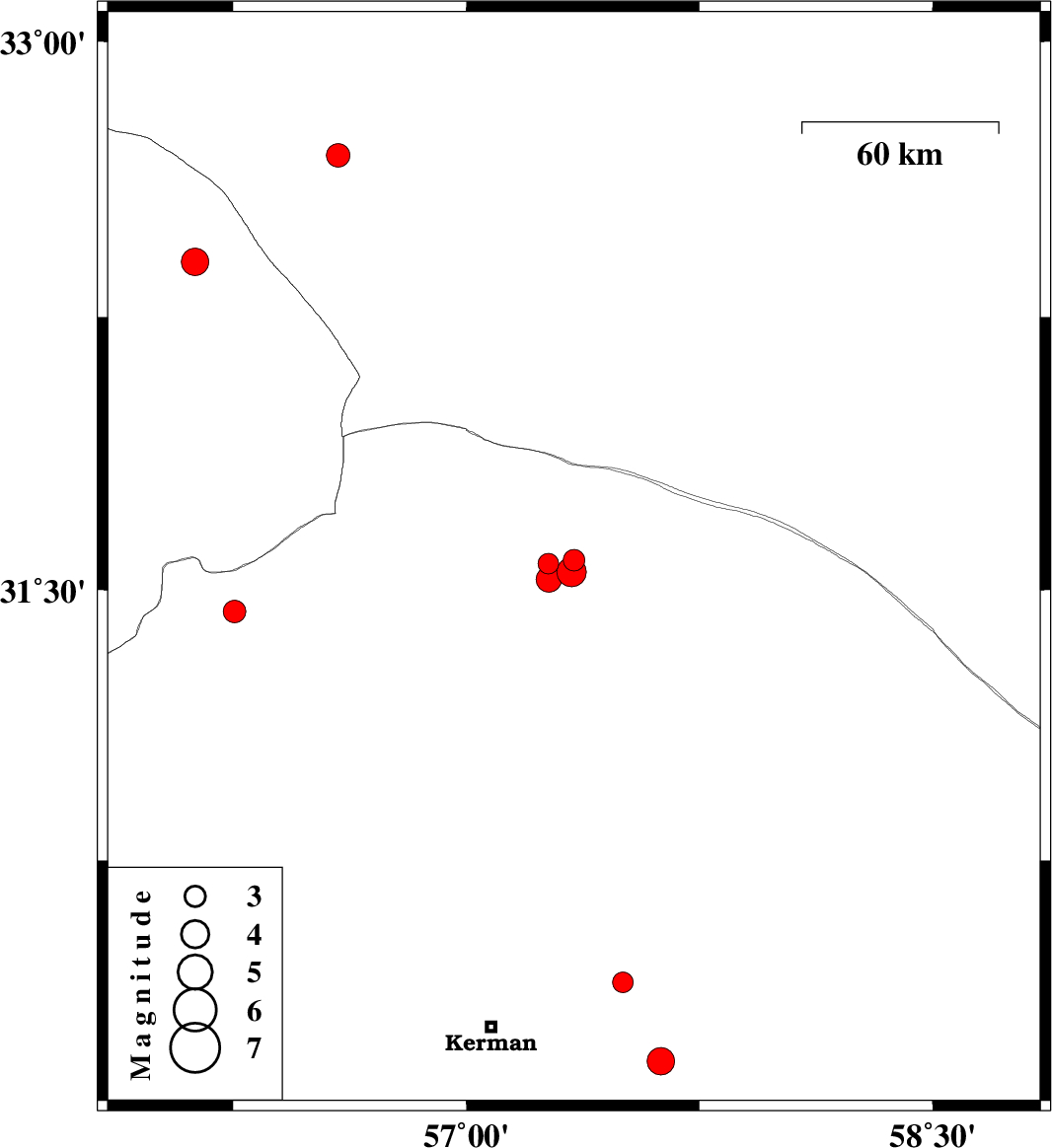 | 2022/09/28 | 02:41:49.9 | 06:11:49.9 | 31.582 | 57.346 | 12 | ML:3.1 | Kerman Province, 62 km North-East of Ravar | ||