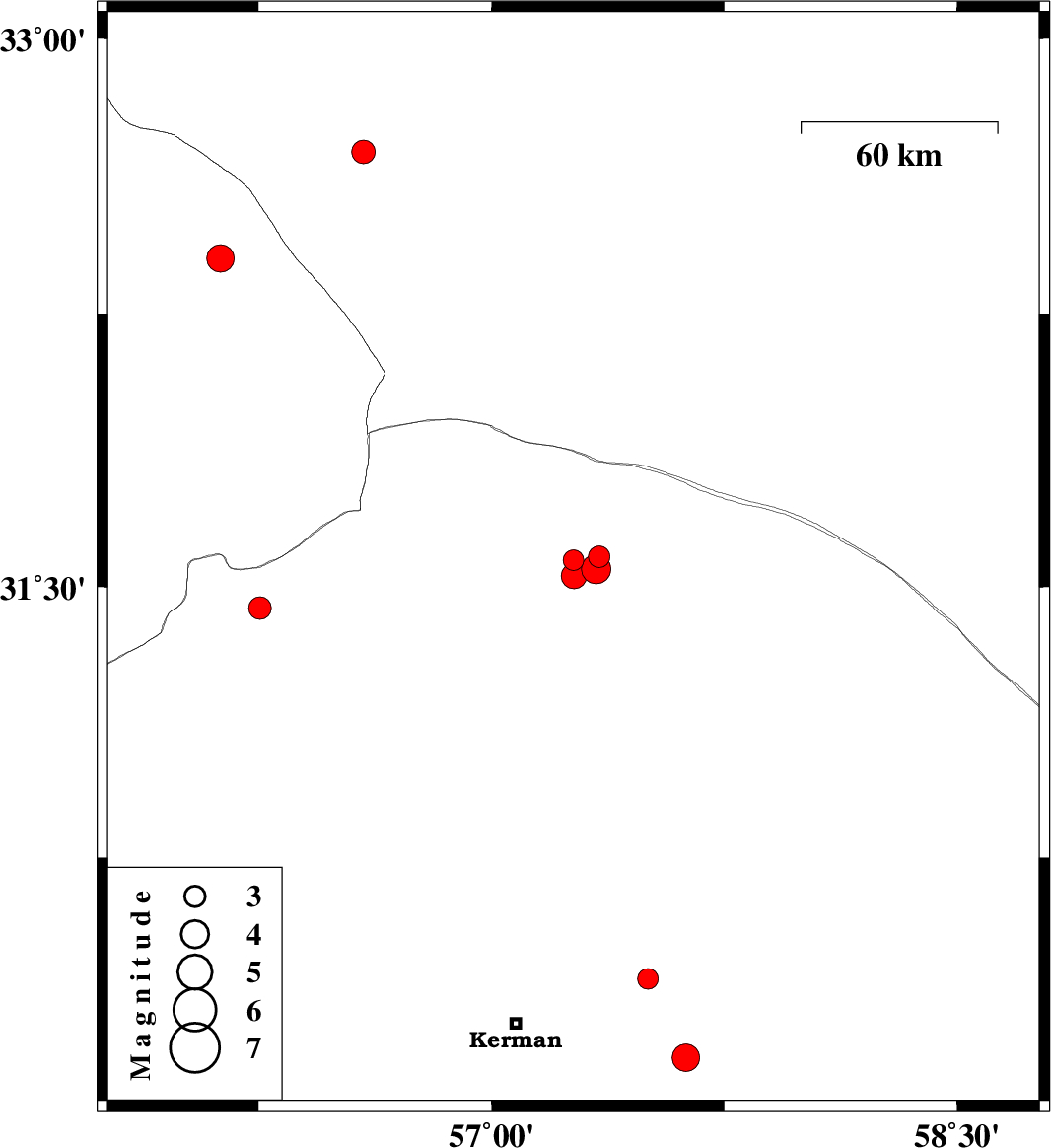 | 2022/09/28 | 02:41:49.9 | 06:11:49.9 | 31.582 | 57.346 | 12 | ML:3.1 | Kerman Province, 62 km North-East of Ravar | ||