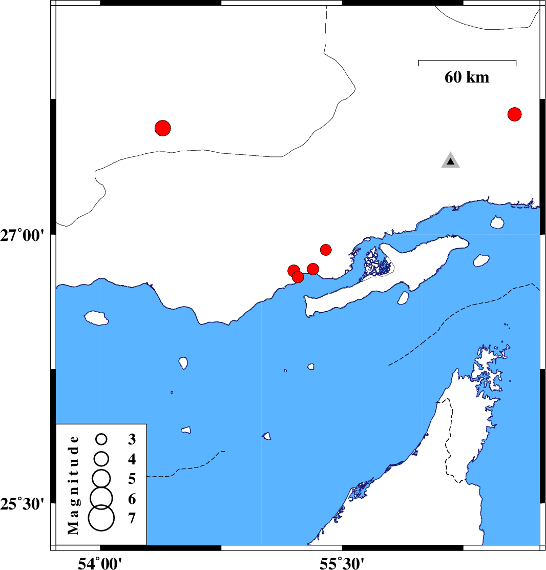 | 2022/10/04 | 02:03:46.7 | 05:33:46.7 | 26.808 | 55.319 | 12 | ML:3.2 | Hormozgan Province, 56 km North-East of Bandar-e lengeh | ||