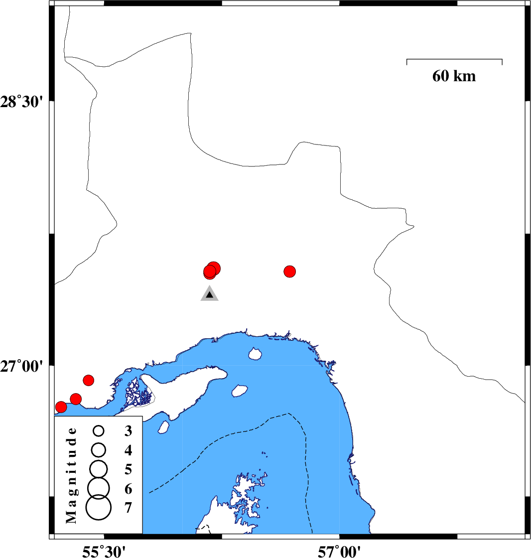 | 2022/10/04 | 01:02:59.3 | 04:32:59.3 | 26.763 | 55.225 | 12 | ML:3.2 | Hormozgan Province, 46 km North-East of Bandar-e lengeh |
