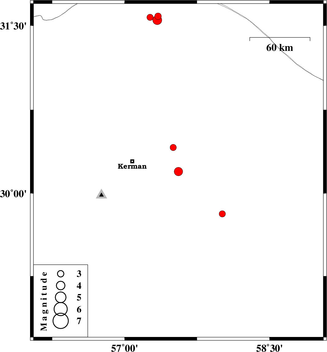 | 2022/09/10 | 16:00:28.0 | 20:30:28.0 | 30.412 | 57.504 | 12 | ML:3 | Kerman Province, 43 km North-East of Kerman |