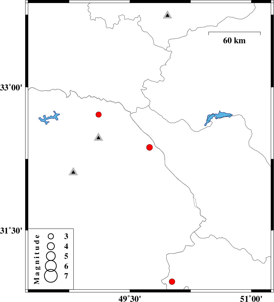 | 2022/10/28 | 09:30:50.2 | 13:00:50.2 | 32.714 | 49.114 | 10 | ML:3.1 | Khoozestan Province, 36 km North of Lali | ||