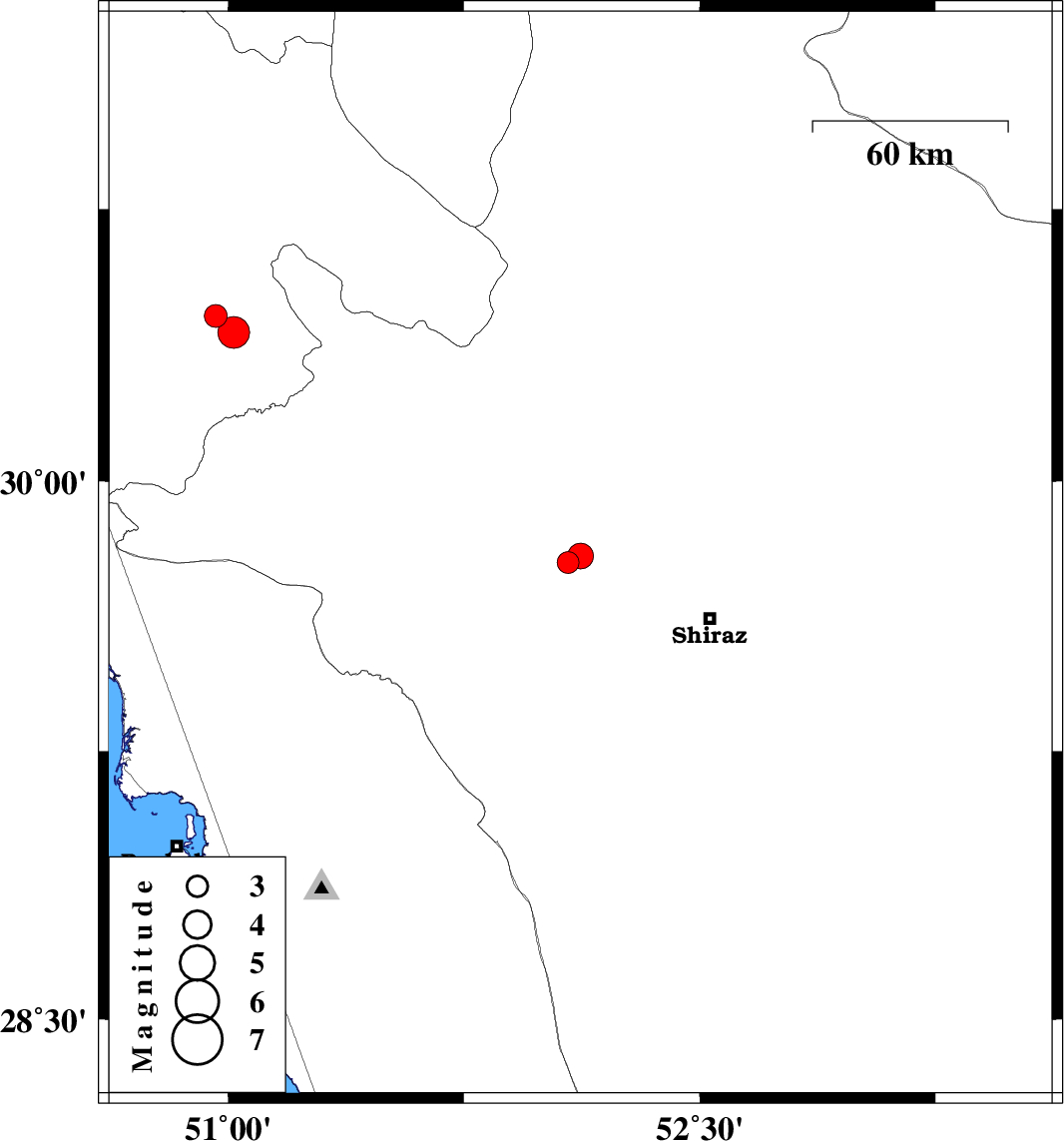 | 2022/10/29 | 15:56:47.0 | 19:26:47.0 | 29.793 | 52.121 | 17 | ML:3.6 | Fars Province, 44 km North-West of Shiraz | ||