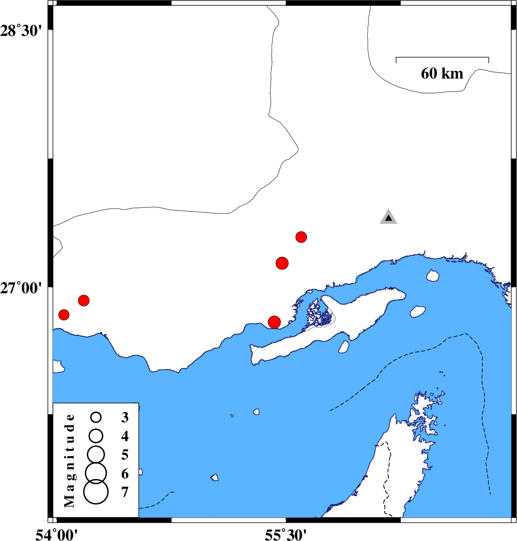 | 2022/10/24 | 11:21:08.8 | 14:51:08.8 | 26.793 | 55.423 | 12 | ML:3.6 | Hormozgan Province, 64 km North-East of Bandar-e lengeh |