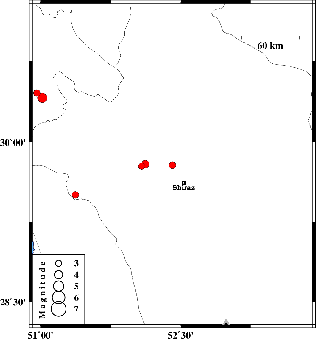 | 2022/10/31 | 01:12:28.6 | 04:42:28.6 | 29.784 | 52.412 | 16 | ML:3.4 | Fars Province, 22 km North-West of Shiraz | ||