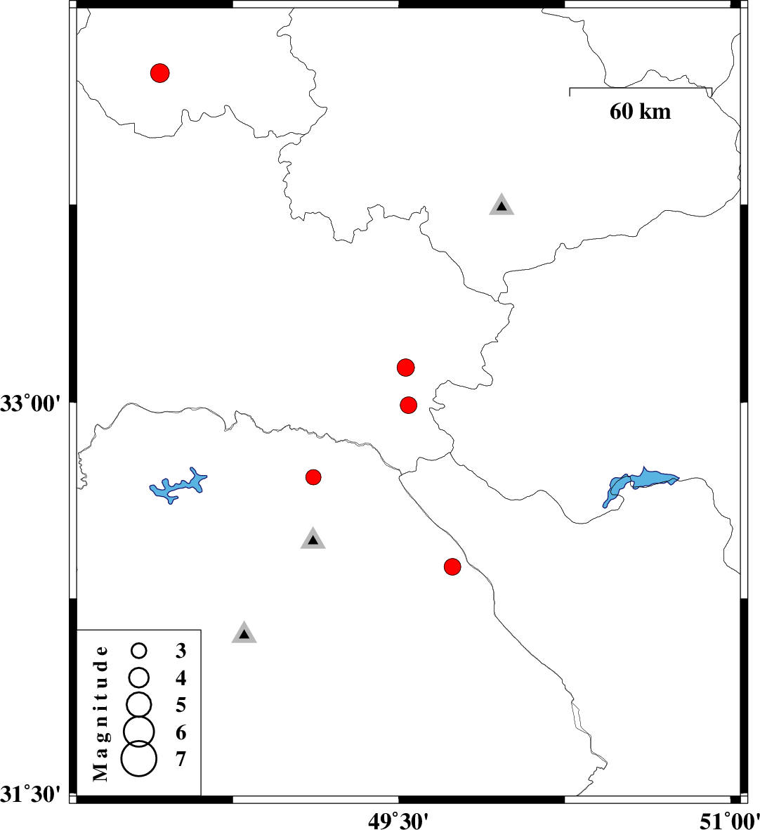 | 2022/10/28 | 09:30:50.2 | 13:00:50.2 | 32.714 | 49.114 | 10 | ML:3.1 | Khoozestan Province, 36 km North of Lali | ||