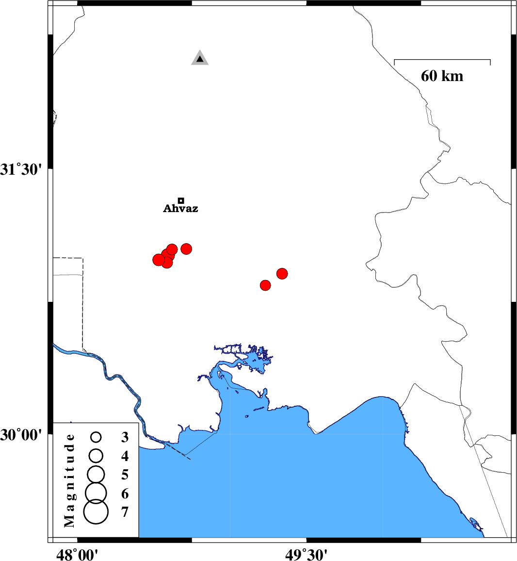 | 2022/09/11 | 07:35:25.2 | 12:05:25.2 | 31.013 | 48.592 | 12 | ML:4 | Khoozestan Province, 35 km South of Ahvaz |