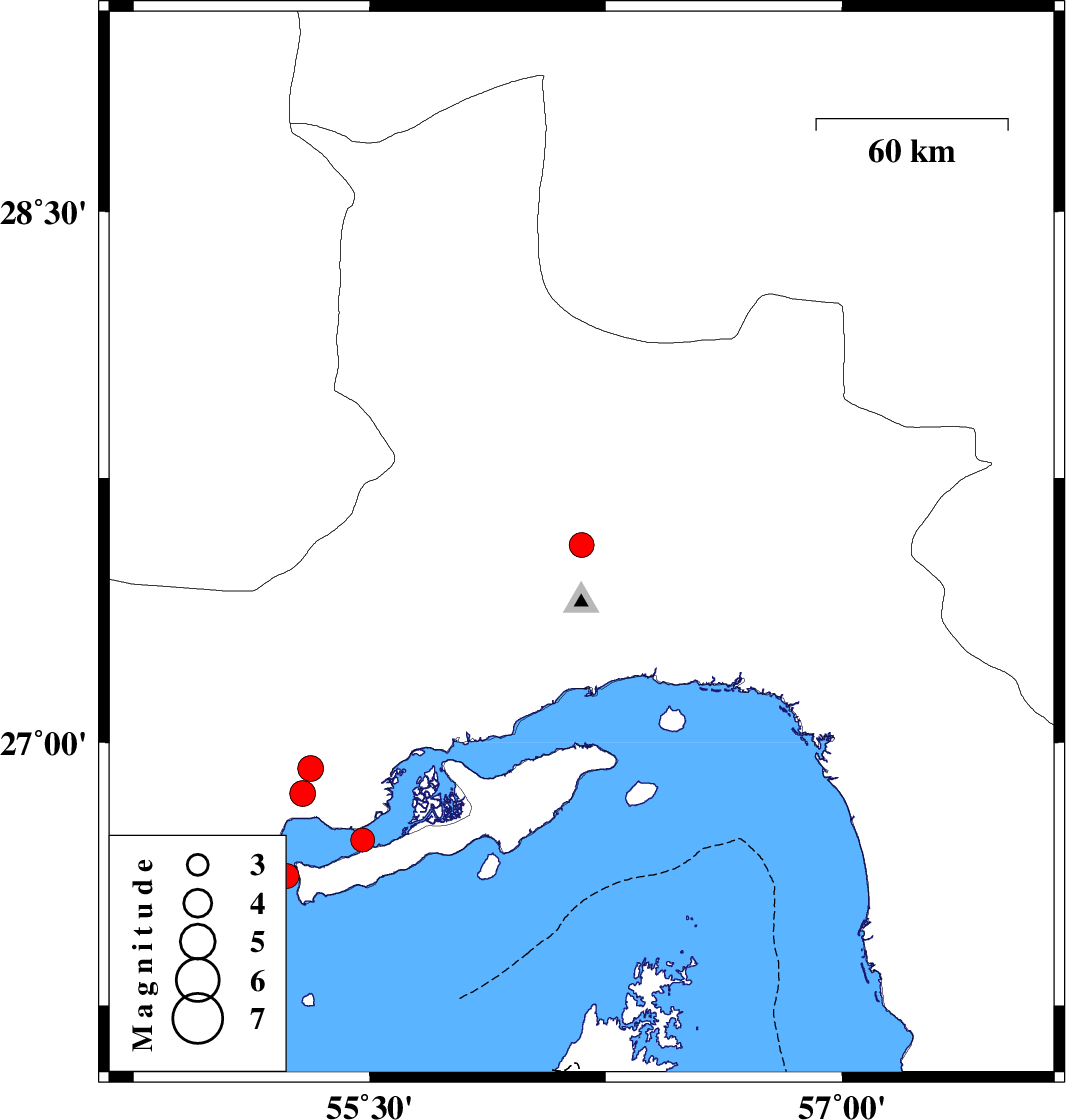 | 2022/07/27 | 13:15:49.0 | 17:45:49.0 | 26.62 | 55.236 | 12 | ML:3.5 | Persian Gulf, 40 km -East of Bandar-e lengeh |