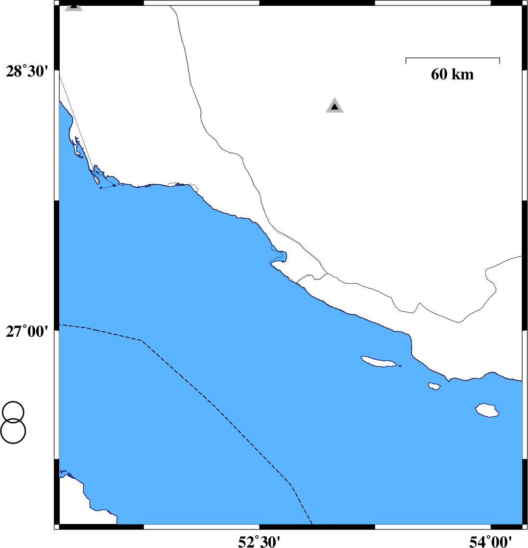 | 2022/12/02 | 03:12:33.6 | 06:42:33.6 | 27.369 | 52.703 | 16 | ML:3.5 | Bushehr Province, 27 km South-West of Mehr | ||