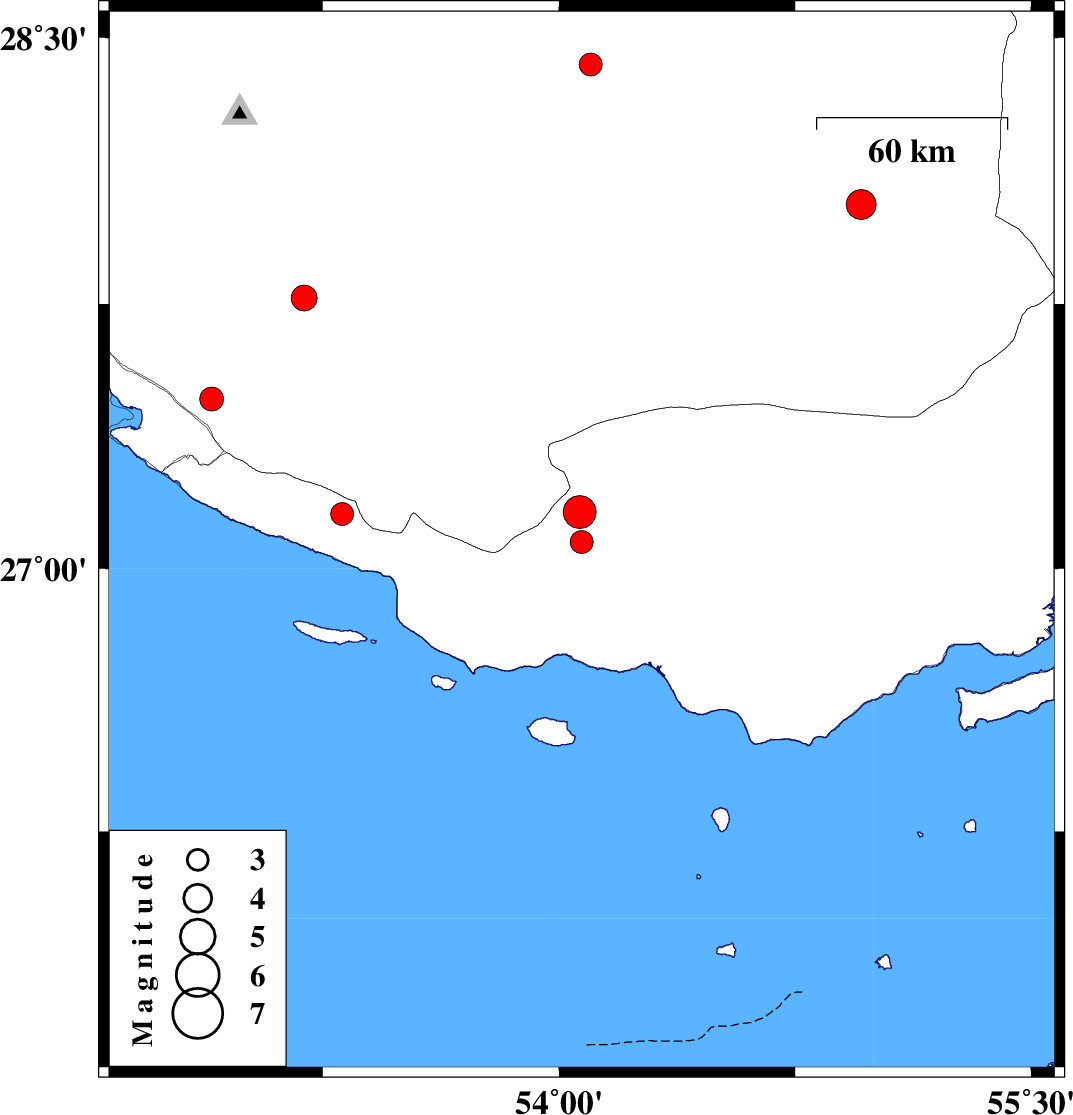 | 2022/05/04 | 06:34:47.4 | 11:04:47.4 | 28.031 | 54.96 | 19 | ML:4.2 | Fars Province, 73 km North-East of Lar |
