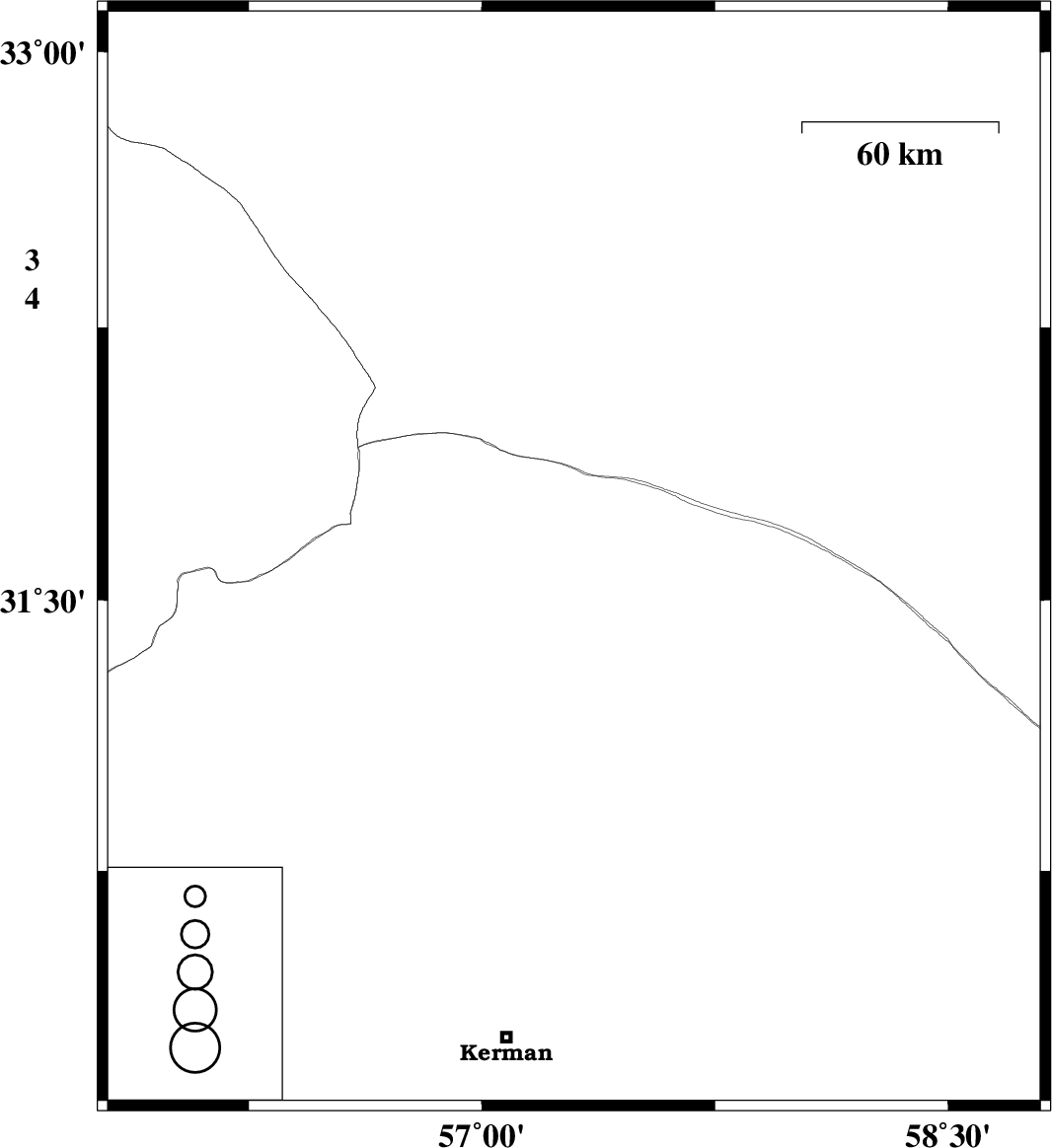 | 2022/12/21 | 09:02:20.1 | 12:32:20.1 | 31.611 | 57.296 | 7 | ML:3.9 | Kerman Province, 60 km North-East of Ravar |