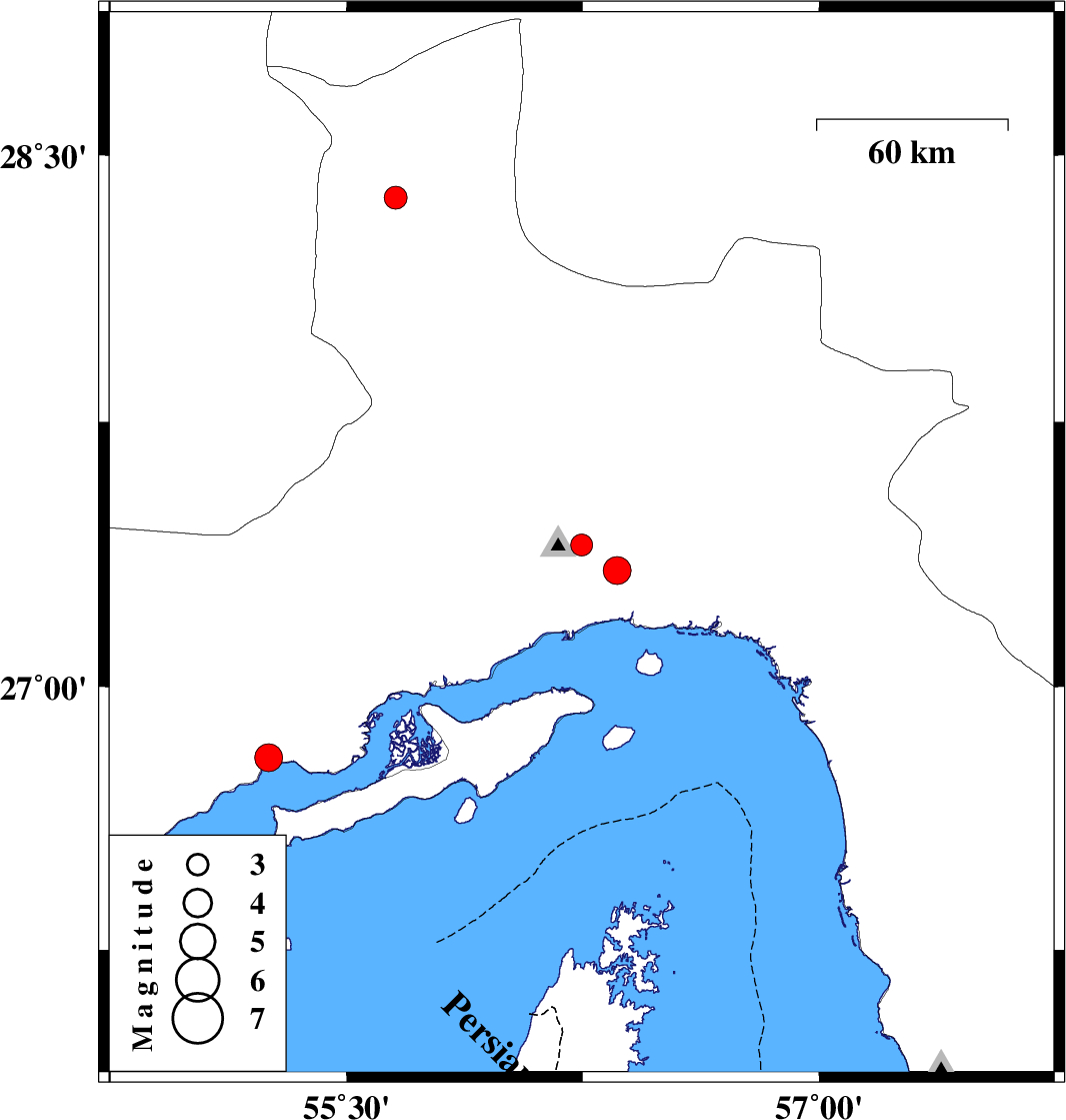 | 2023/01/01 | 14:36:23.1 | 18:06:23.1 | 27.33 | 56.359 | 12 | ML:4 | Hormozgan Province, 18 km North of Bandar-e abbas |