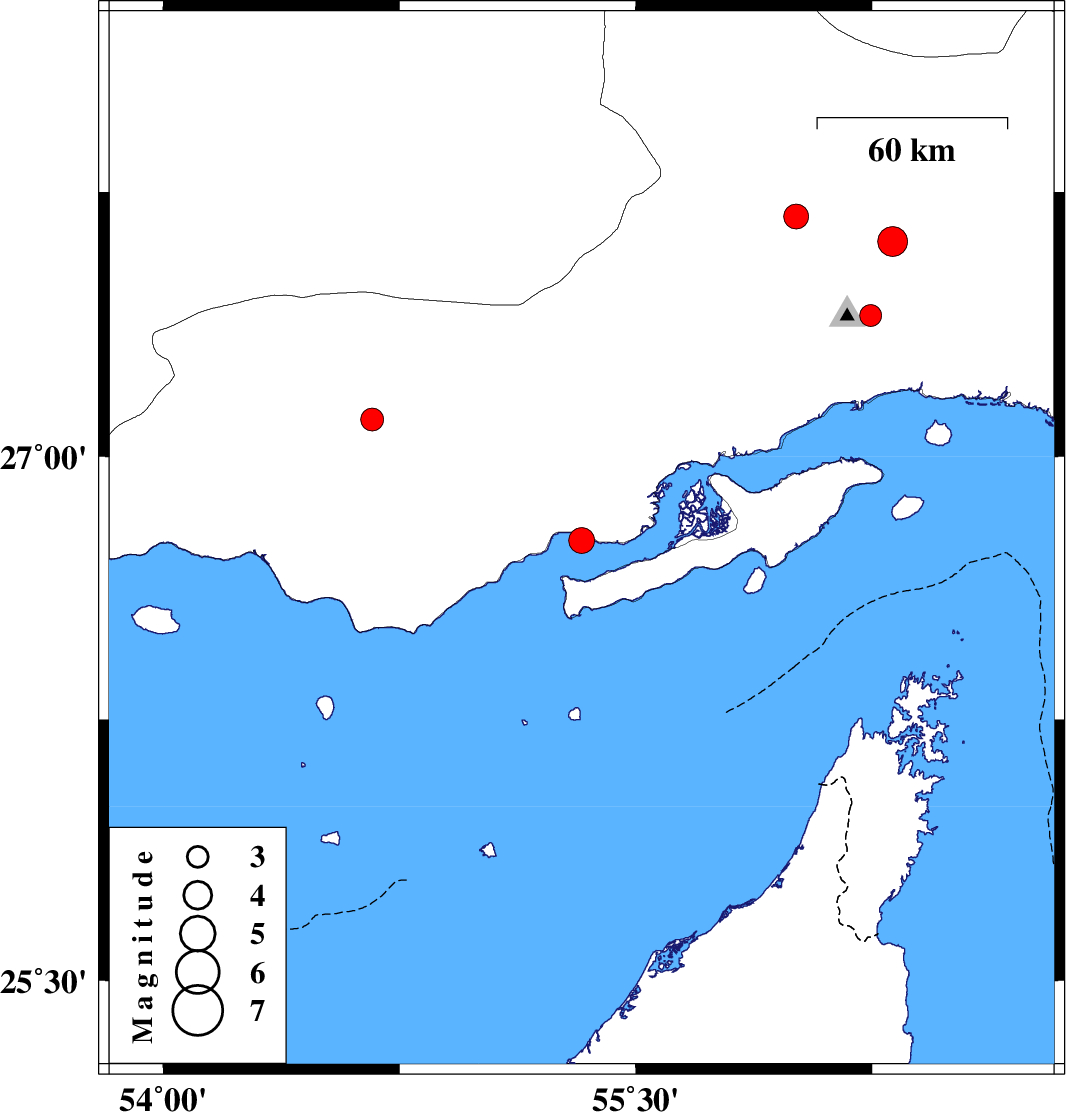 | 2023/01/12 | 08:44:30.9 | 12:14:30.9 | 26.761 | 55.328 | 10 | ML:3.6 | Persian Gulf, 54 km North-East of Bandar-e lengeh | ||