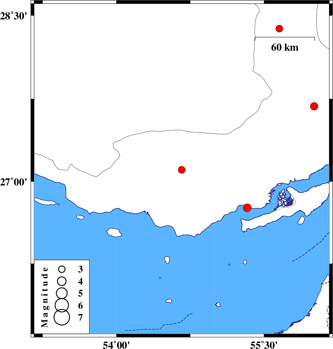 | 2023/01/12 | 08:44:30.9 | 12:14:30.9 | 26.761 | 55.328 | 10 | ML:3.6 | Persian Gulf, 54 km North-East of Bandar-e lengeh | ||