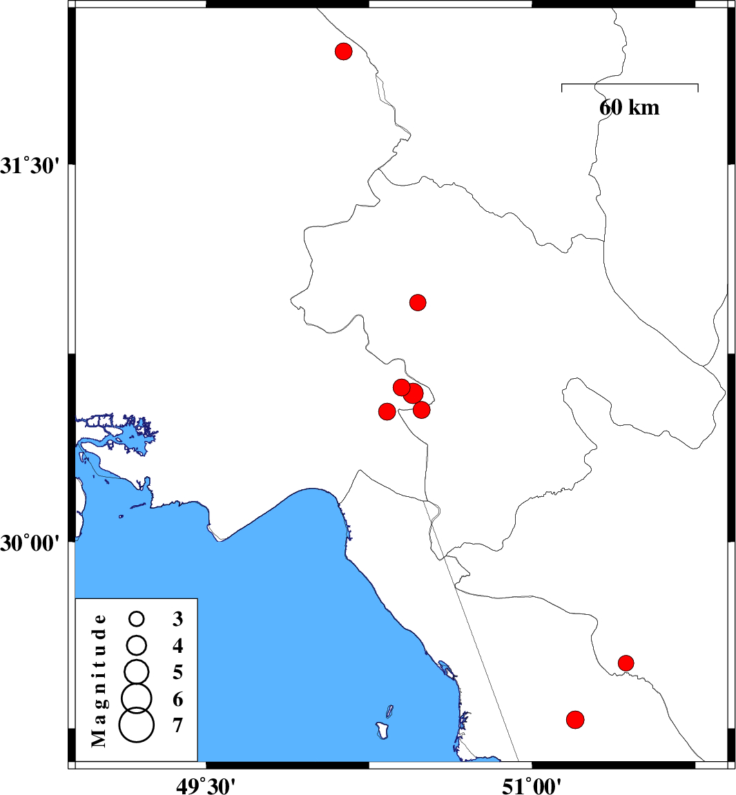 | 2023/01/27 | 06:19:30.8 | 09:49:30.8 | 29.284 | 51.197 | 16 | ML:3.6 | Bushehr Province, 3 km of Borazjan | ||