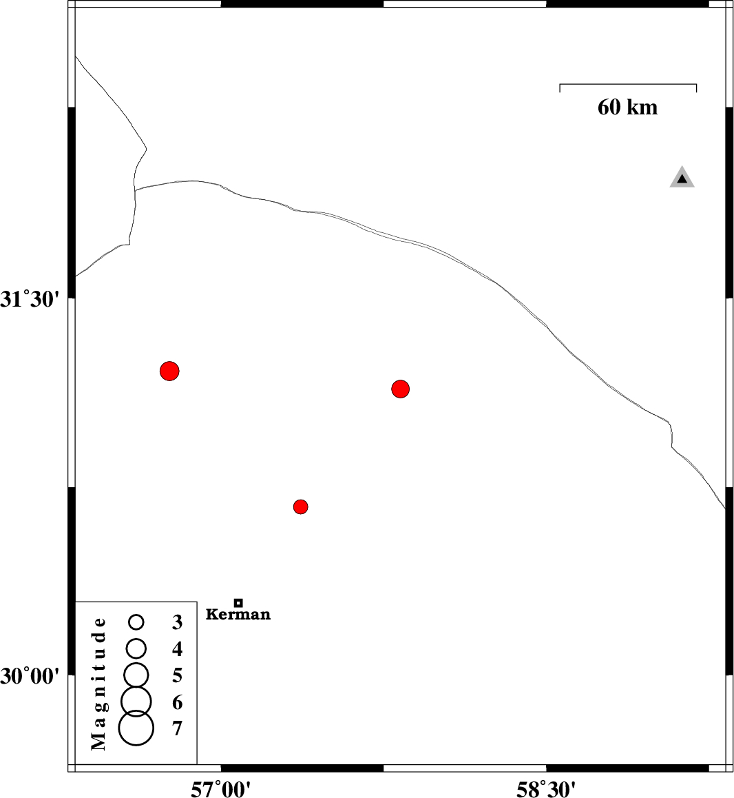 | 2022/06/14 | 22:38:43.2 | 03:08:43.2 | 30.672 | 57.367 | 9 | ML:2.9 | Kerman Province, 51 km North-East of Kerman | ||