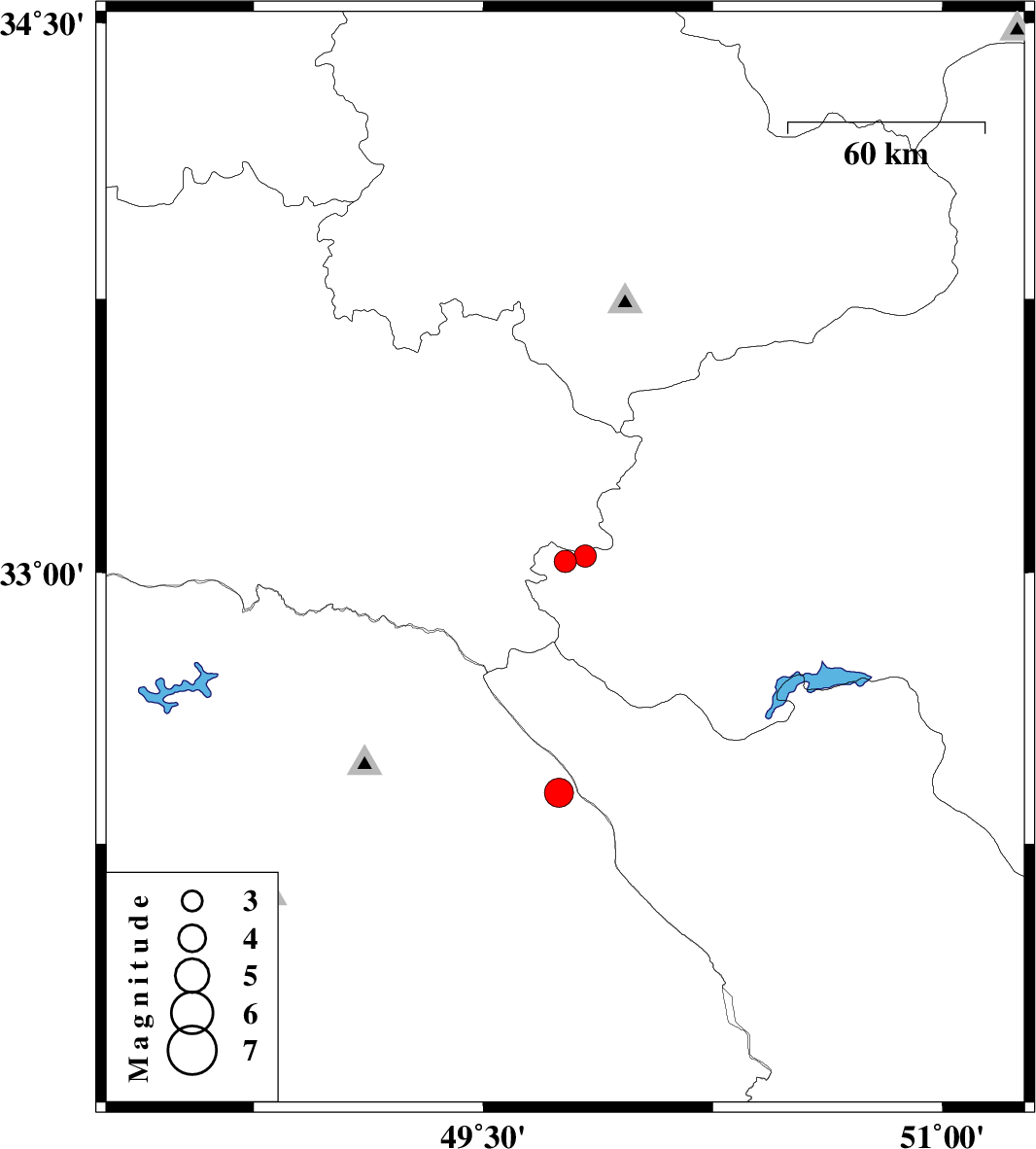 | 2023/01/30 | 17:40:26.6 | 21:10:26.6 | 33.045 | 49.833 | 10 | ML:3.3 | Esfahan Province, 28 km North-West of Fereydunshahr |