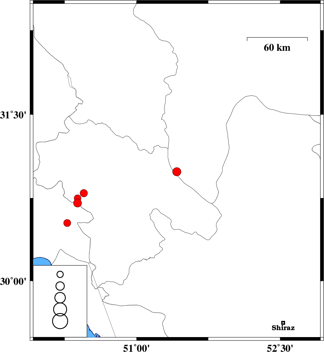 | 2023/02/21 | 01:29:17.4 | 04:59:17.4 | 30.705 | 50.385 | 8 | ML:3.8 | Khoozestan Province, 18 km North-East of Behbahan | ||