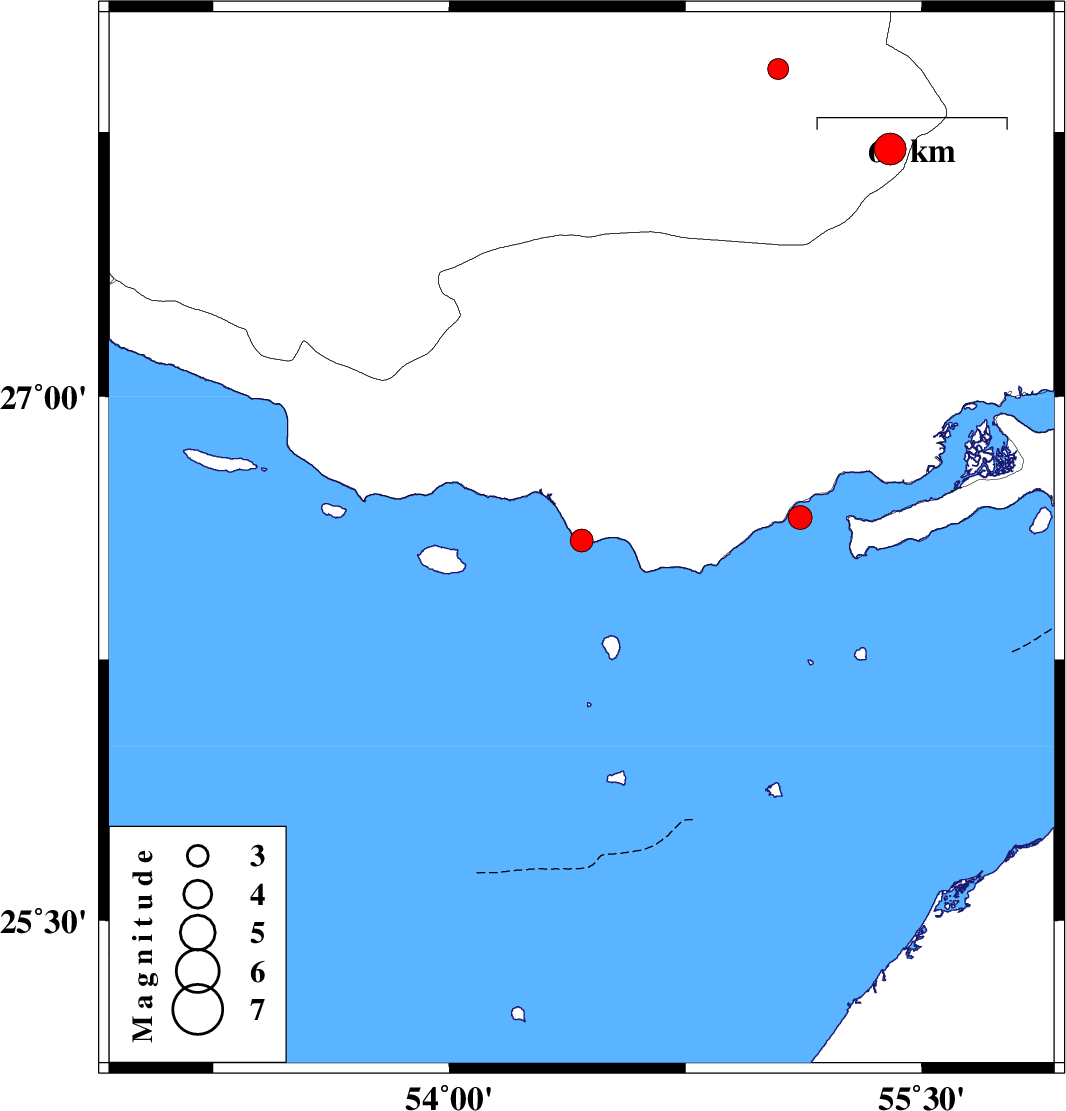 | 2023/03/07 | 17:55:56.0 | 21:25:56.0 | 26.59 | 54.42 | 12 | ML:3.2 | Persian Gulf, 43 km -West of Bandar-e lengeh | ||