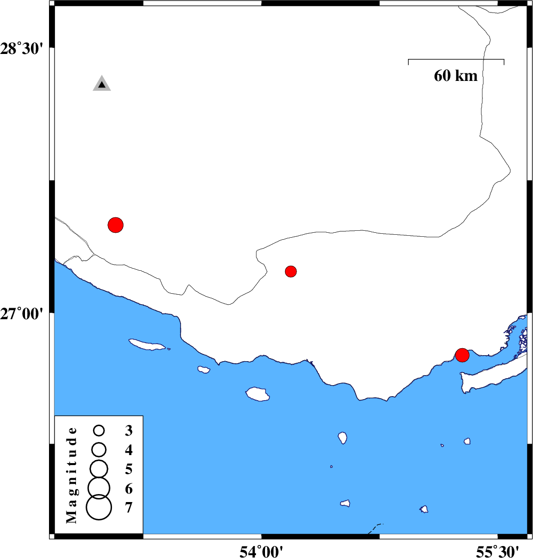 | 2023/03/13 | 09:09:19.4 | 12:39:19.4 | 26.758 | 55.276 | 12 | ML:3.9 | Persian Gulf, 50 km North-East of Bandar-e lengeh | ||