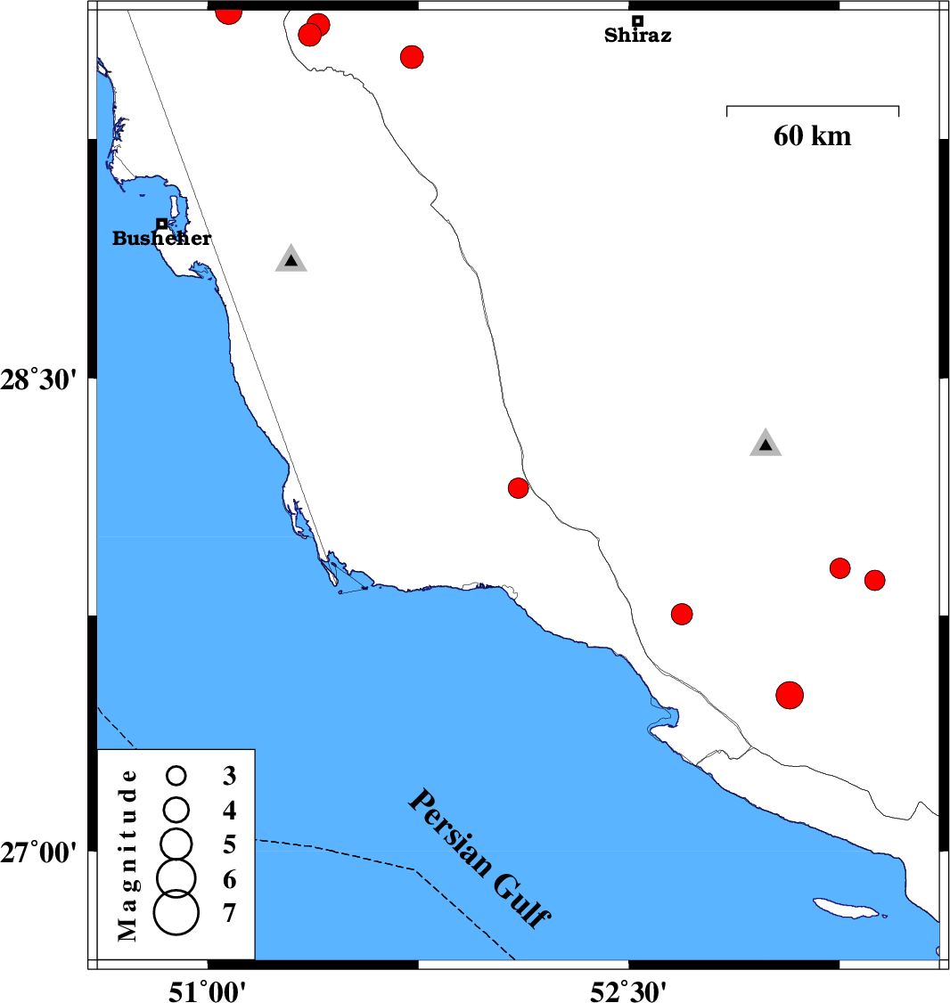 | 2023/03/01 | 11:29:30.0 | 14:59:30.0 | 27.754 | 52.689 | 14 | ML:3.4 | Fars Province, 30 km North-West of Mehr |