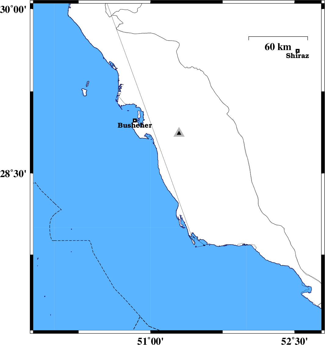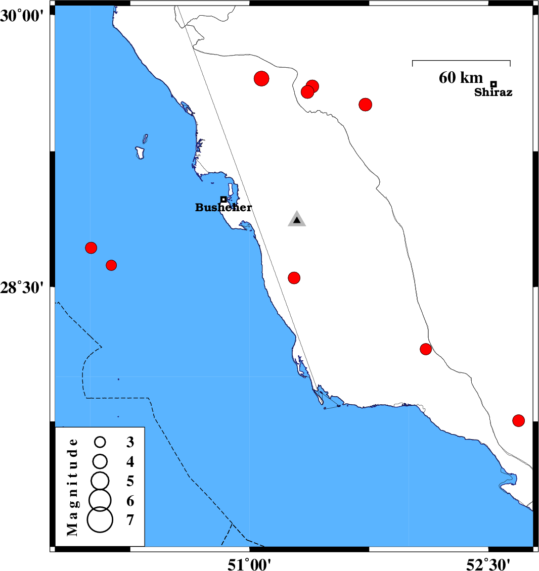 | 2023/03/06 | 15:07:48.4 | 18:37:48.4 | 28.716 | 50.005 | 12 | ML:3.2 | Persian Gulf, 86 km South-West of Busheher | ||