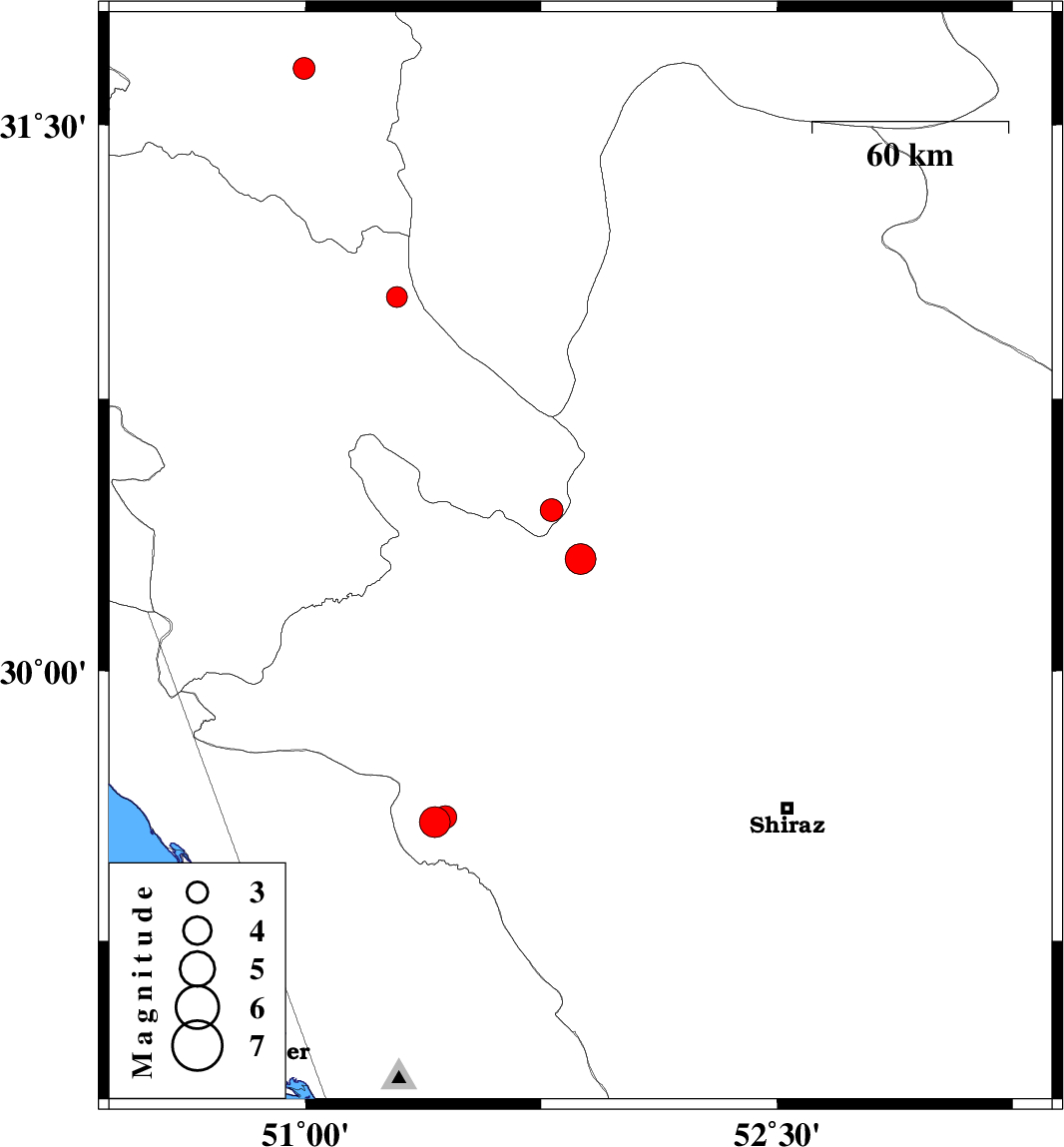 | 2023/03/25 | 18:13:09.9 | 21:43:09.9 | 29.58 | 51.412 | 17 | ML:4.4 | Fars Province, 24 km -West of Kazerun | ||