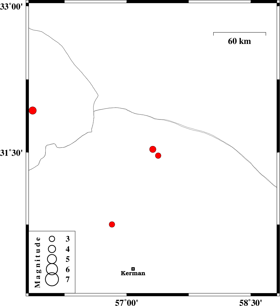 | 2023/03/26 | 03:40:35.7 | 07:10:35.7 | 31.466 | 57.382 | 16 | ML:3.1 | Kerman Province, 59 km North-East of Ravar |