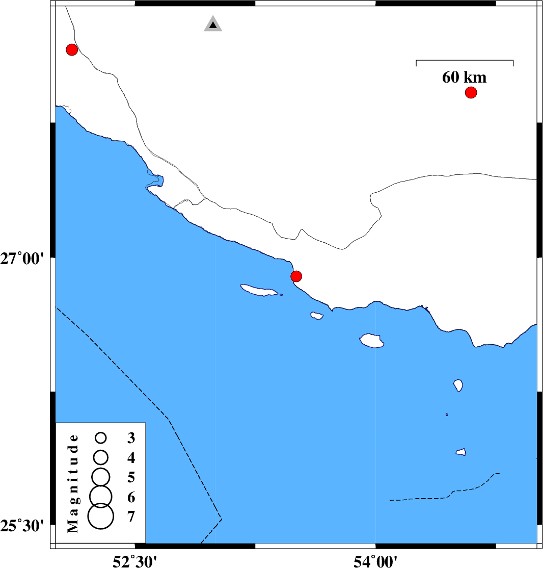 | 2023/03/25 | 01:50:57.9 | 05:20:57.9 | 27.917 | 54.595 | 9 | ML:3.3 | Fars Province, 37 km North-East of Lar | ||