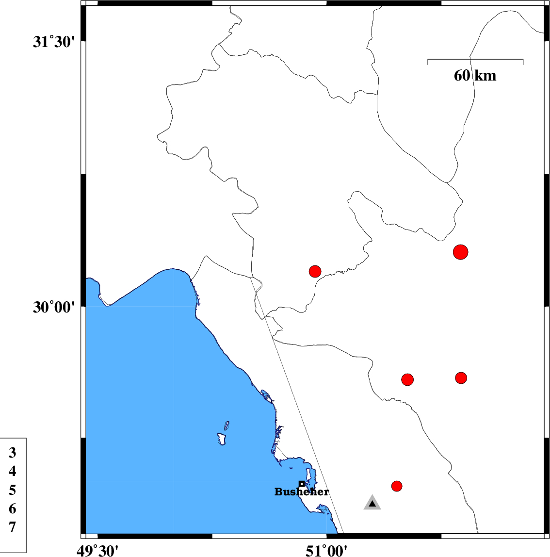 | 2023/03/29 | 23:05:56.4 | 02:35:56.4 | 28.97 | 51.458 | 15 | ML:3.1 | Bushehr Province, 22 km -East of Ahram | ||