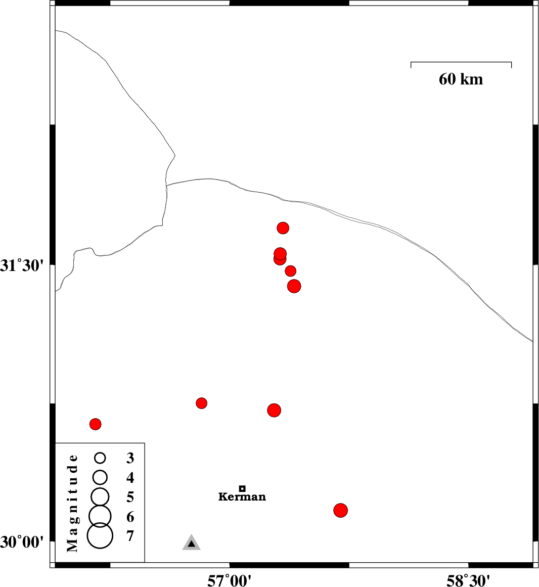 | 2023/04/08 | 11:34:29.8 | 15:04:29.8 | 30.169 | 57.696 | 10 | ML:3.9 | Kerman Province, 61 km South-East of Kerman | ||