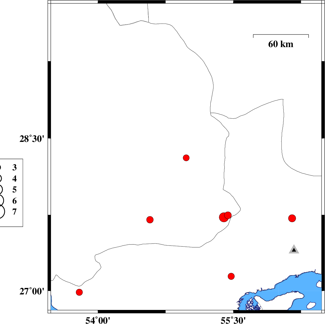 | 2023/04/27 | 10:20:48.8 | 13:50:48.8 | 27.726 | 55.396 | 10 | ML:4.6 | Fars Province, 82 km South-West of Hajiabad | ||