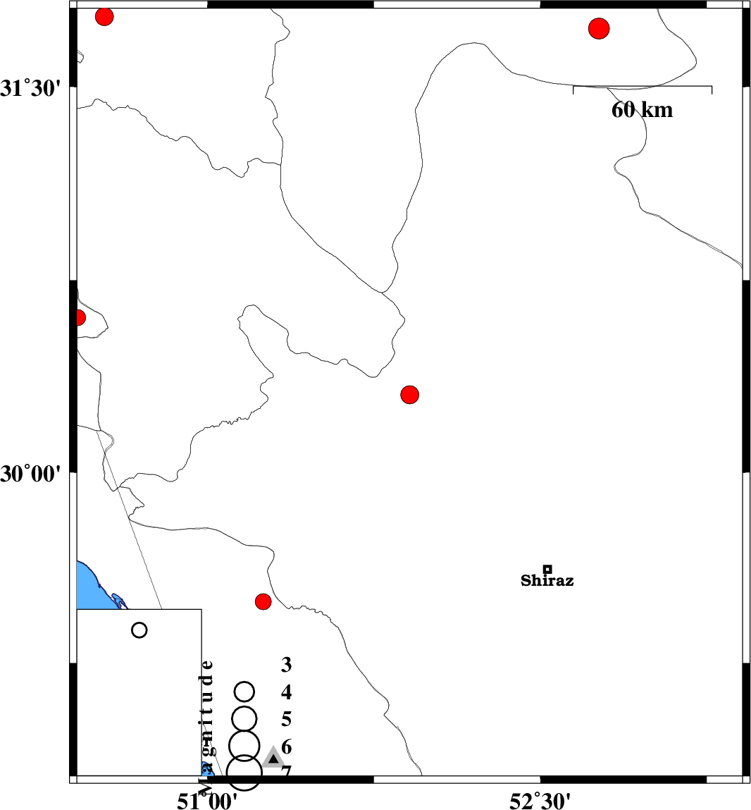 | 2023/04/21 | 12:05:07.0 | 15:35:07.0 | 29.491 | 51.251 | 8 | ML:3.3 | Bushehr Province, 26 km North of Borazjan | ||