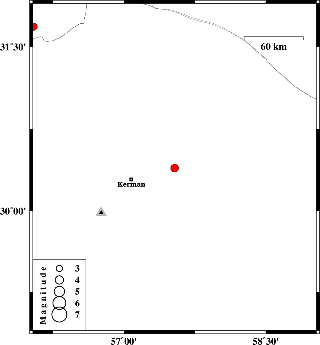 | 2023/05/18 | 13:48:57.1 | 17:18:57.1 | 30.391 | 57.536 | 8 | ML:3.8 | Kerman Province, 45 km North-East of Kerman | ||