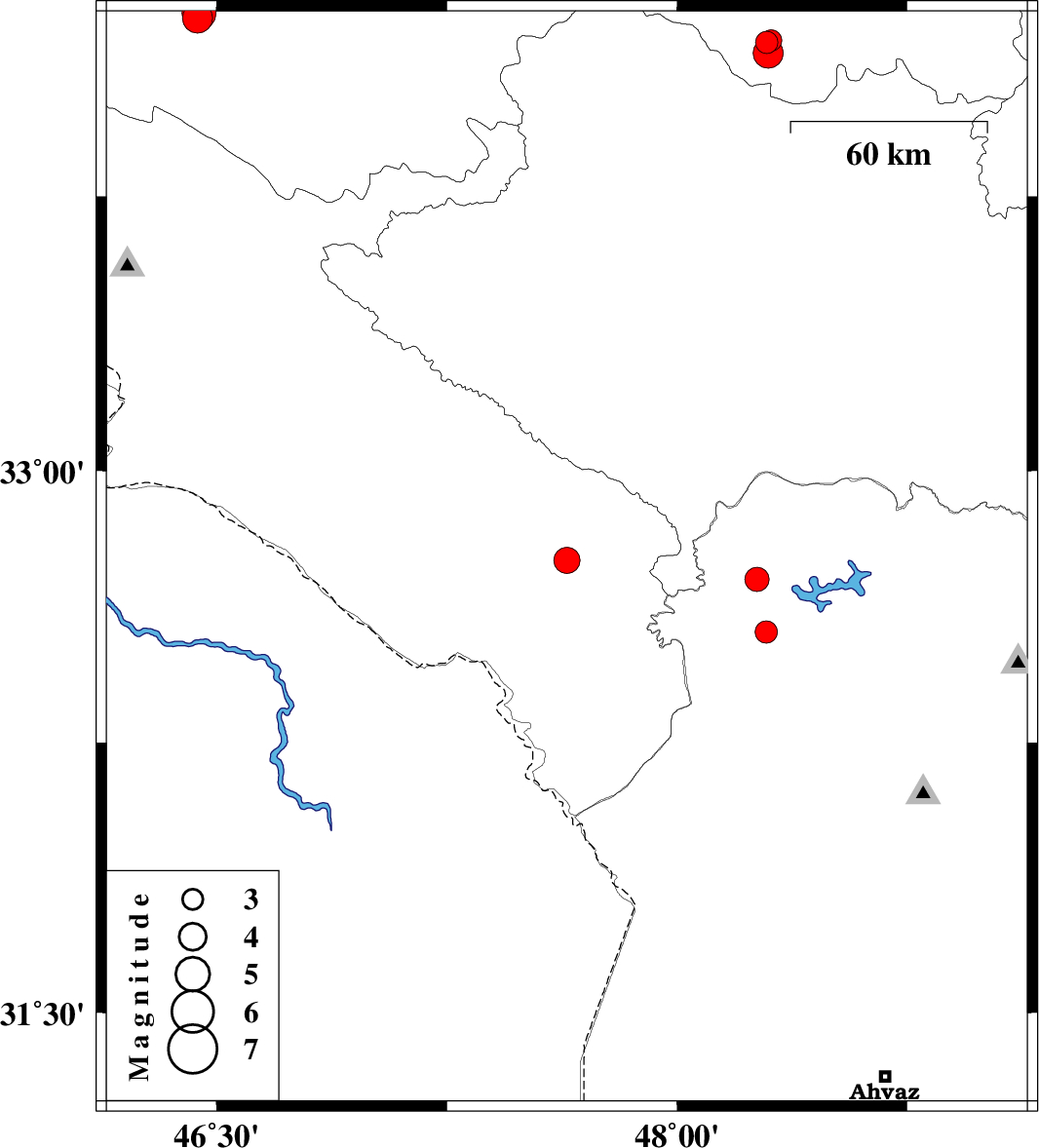 | 2023/06/04 | 16:22:10.1 | 19:52:10.1 | 32.701 | 48.26 | 12 | ML:3.5 | Khoozestan Province, 28 km North of Andimeshk | ||