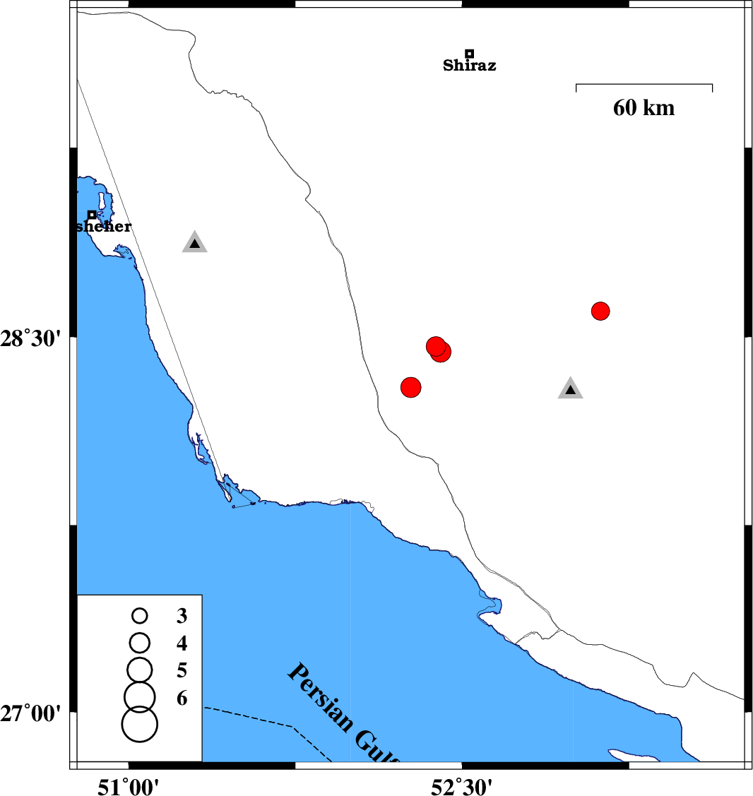 | 2023/06/15 | 17:30:02.2 | 21:00:02.2 | 28.462 | 52.382 | 10 | ML:4 | Fars Province, 46 km South-West of Firuz Abad | ||