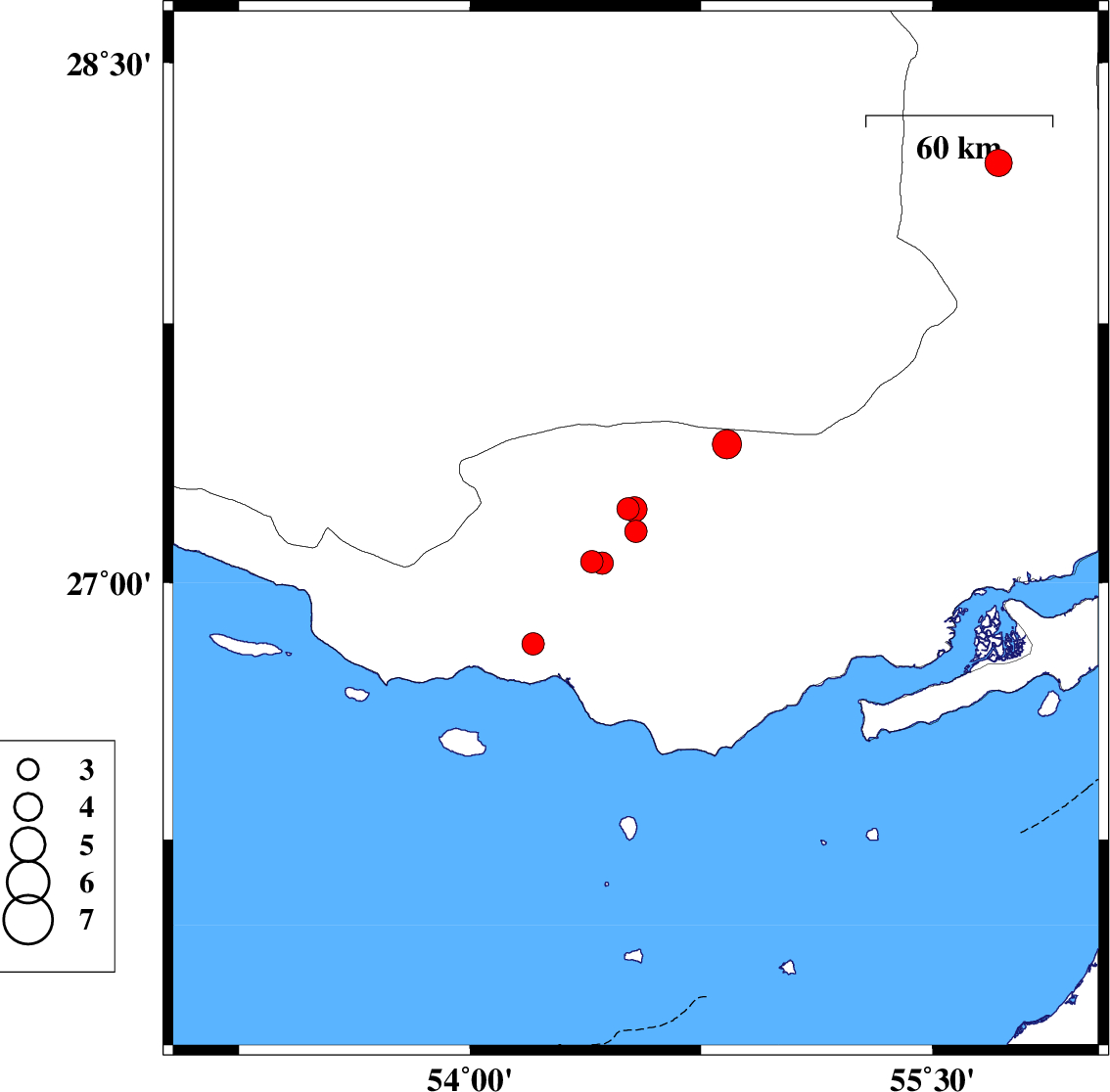 | 2023/06/22 | 11:55:48.5 | 15:25:48.5 | 27.401 | 54.834 | 16 | ML:4.2 | Hormozgan Province, 52 km North-East of Bastak |