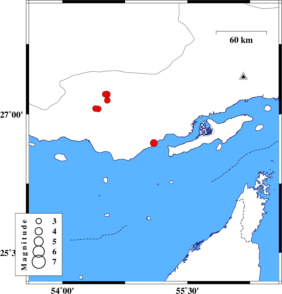 | 2023/06/26 | 07:39:10.2 | 11:09:10.2 | 27.214 | 54.512 | 20 | ML:3.2 | Hormozgan Province, 15 km -East of Bastak | ||