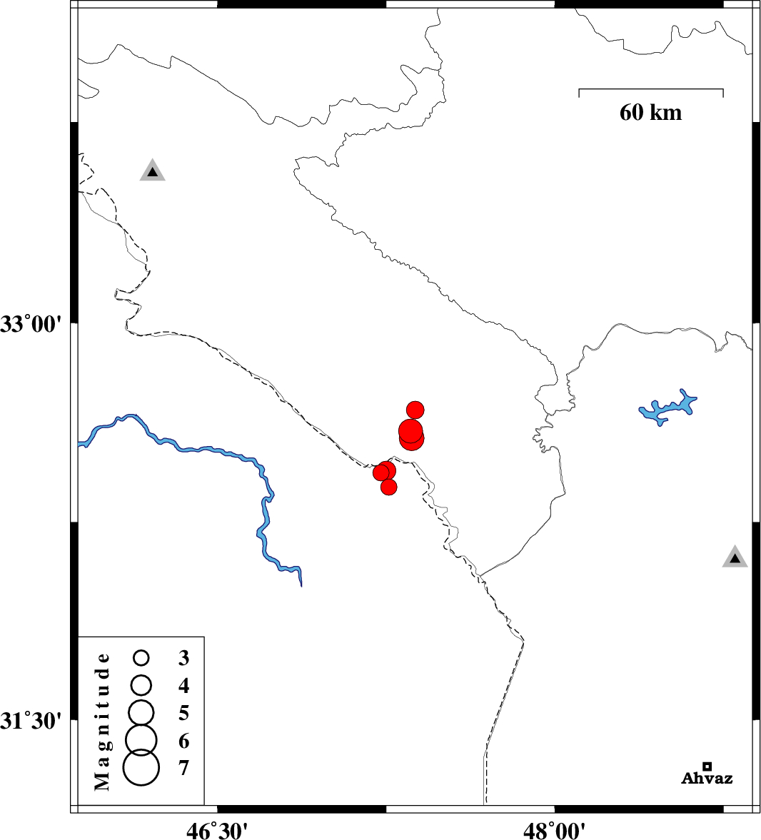 | 2023/06/28 | 19:23:01.6 | 22:53:01.6 | 32.382 | 47.261 | 12 | ML:3.3 | Iraq, 35 km South of Dehloran | ||